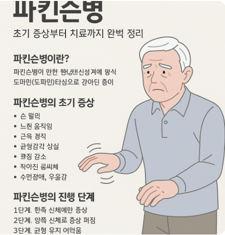 파킨슨병(Parkinson’s Disease)은 중추신경계에 영향을 주는 만성 퇴행성 신경 질환으로, 주로 운동 조절 능력에 이상이 생기는 병입니다. 주로 60세 이상에서 많이 발생하지만, 드물게 40대 이하의 젊은 층에서도 발병하는 경우도 있습니다. 도파민(dopamine)이라는 신경전달물질의 부족으로 인해 발생하며, 증상은 점진적으로 악화되는 것이 특징입니다.