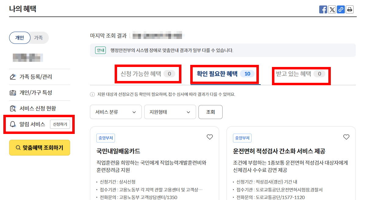 개인뿐만 아니라 따로 사는 부모님의 보조금도 확인이 가능한데요.