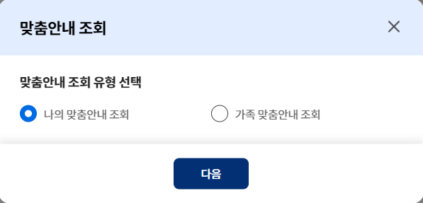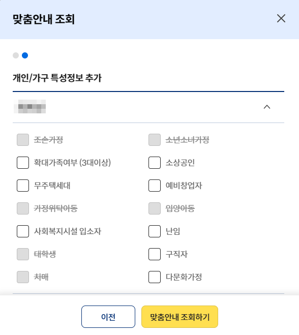 해당하는 개인/가구 특정정보를 추가하여 상황과 환경에 맞는 맞춤안내 조회가 가능합니다.